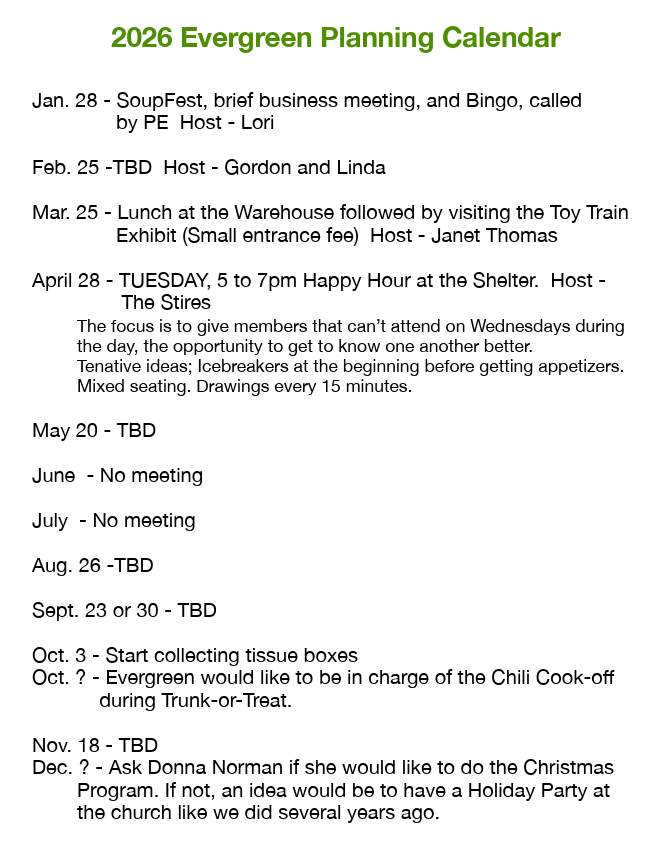 We welcome new ieas as we continue to develop. If you have any questions or interest in joing the Evergreen committee, please contact Debbie R., Pat L., or Nancy S. or just stop in at the next event.